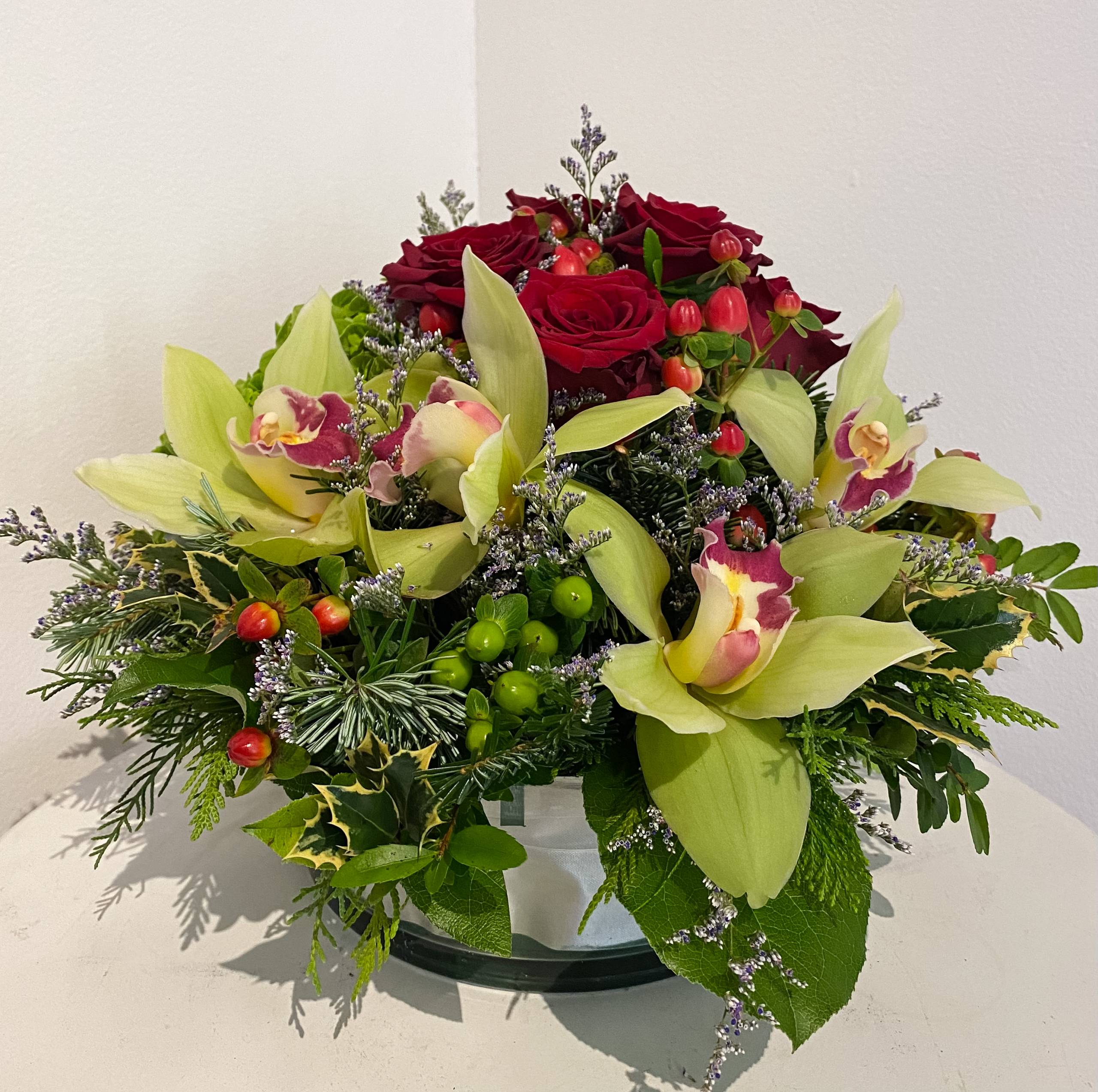 An elegant centerpiece for your dining tables with Christmasy colors created with roses, orchids, and hydrangeas. This could also be a great present to surprise your loved ones during Chirstmas.