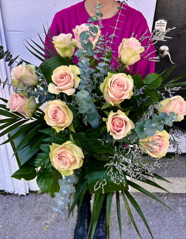 This beautiful bouquet is created with our premium Roses artfully sorted with multiple types of greens and fillers suitable for Valentine’s and anniversaries. Please note for this arrangement designer chooses fillers and greens based on our freshest availability.