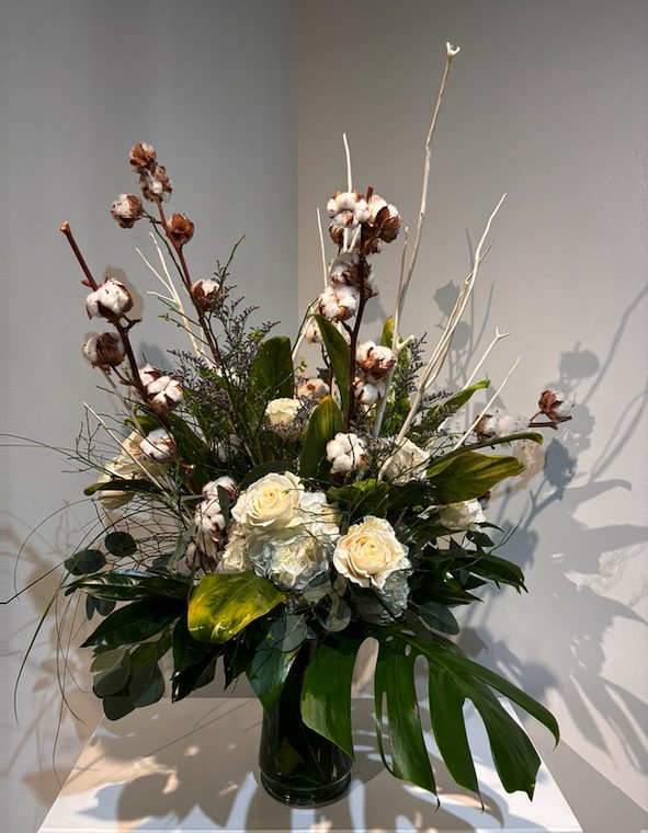 - This arrangement includes a glass vase