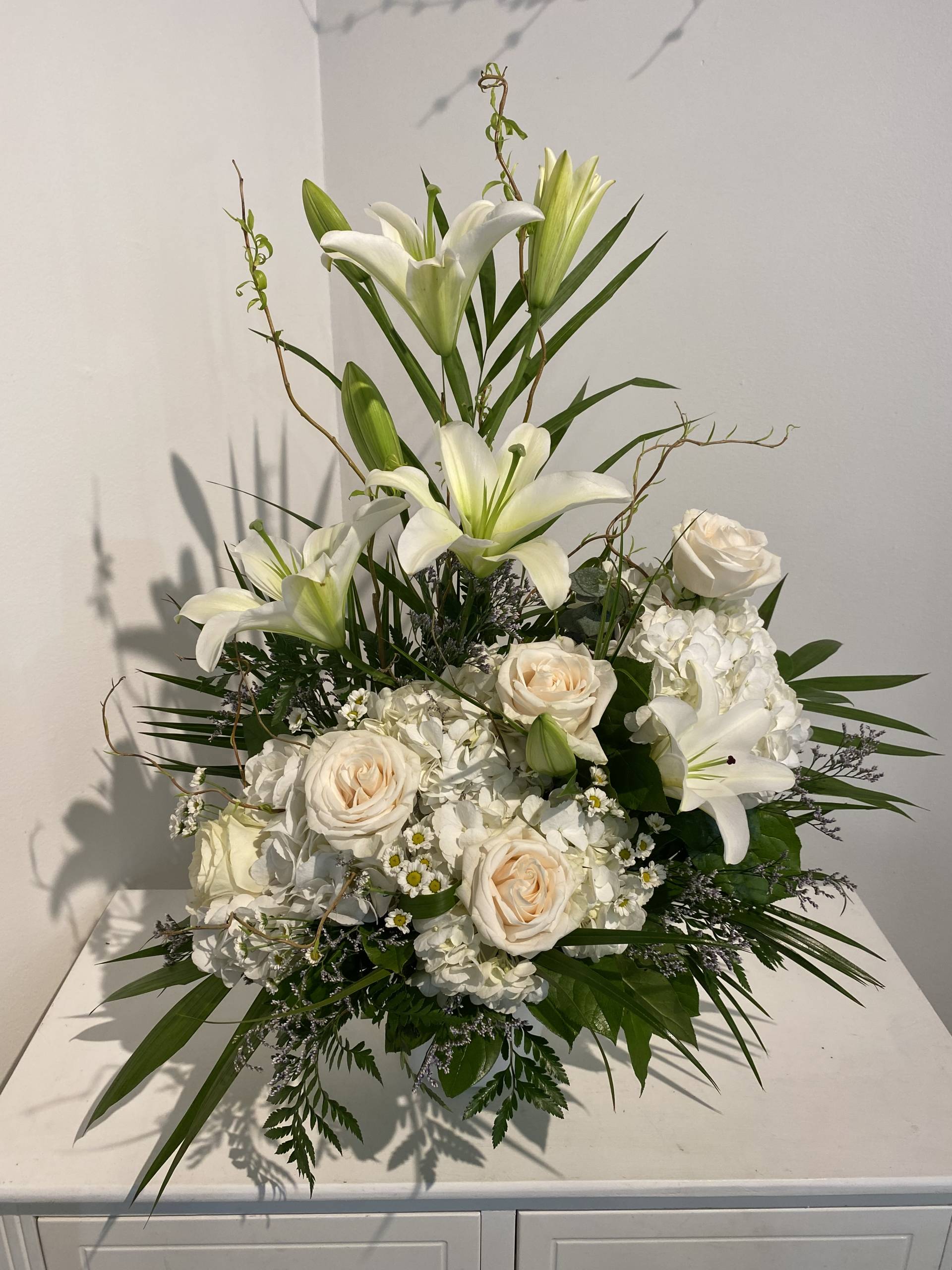 Introducing “White Diamond” – a stunning blend of serene whites and lush greens, perfect for any occasion. This one-sided arrangement features hydrangeas, roses, and lilies artfully layered with vibrant greens. Add timeless elegance to your celebration with “White Diamond.”